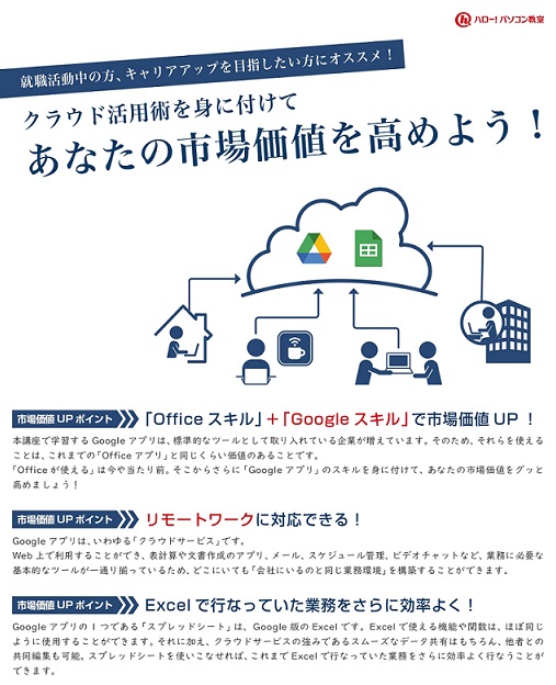 教室では、Google社が提供しているスプレッドシート講座も受講できます。
